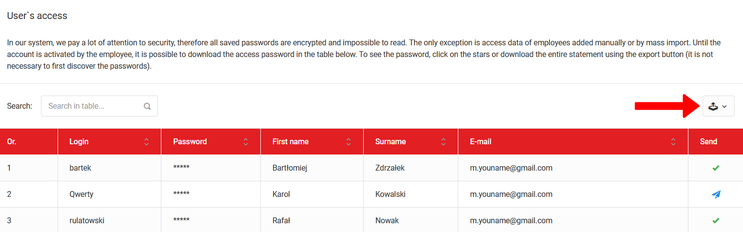 Once you have created your employees' accounts, their logins and passwords to the system can be found in the tab club employees credentials. The access data can be delivered in traditional, paper form by downloading the data to a PDF file. To do this, click on the data export to file icon in the top right corner. You can also send an individual e-mail to an employee with access data by clicking on the blue icon in the last column of the table.