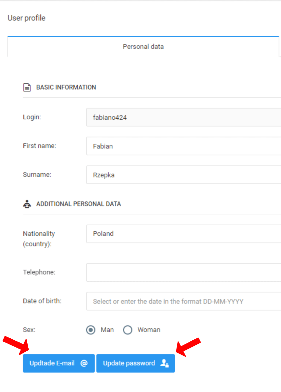 To change your ProTrainUp e-mail address or password, click on your name in the top-right corner. Then select the "edit profile" option from the menu that appears. The next step is to click on the "update email" or "update password" button. After clicking the option you are interested in, the system will ask you for the current password and a new e-mail or password.