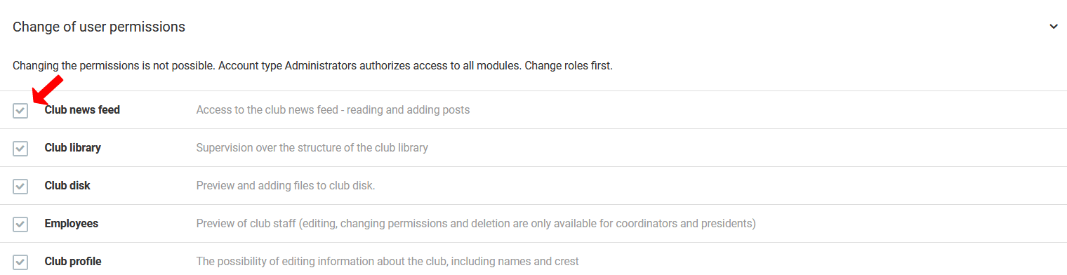 Nakon klika na dozvole, bit ćete preusmjereni na stranicu na kojoj možete vidjeti sve moguće upravljačke module. Označavanjem sljedećih potvrdnih okvira dat ćete korisnička dopuštenja za module. Imajte na umu da su neki od modula ključni za sustav i podatke sadržane u njima, pa dobro razmislite kome dajete pristup ključnim modulima. Uklanjanje određenih elemenata u sustavu je nepovratno!