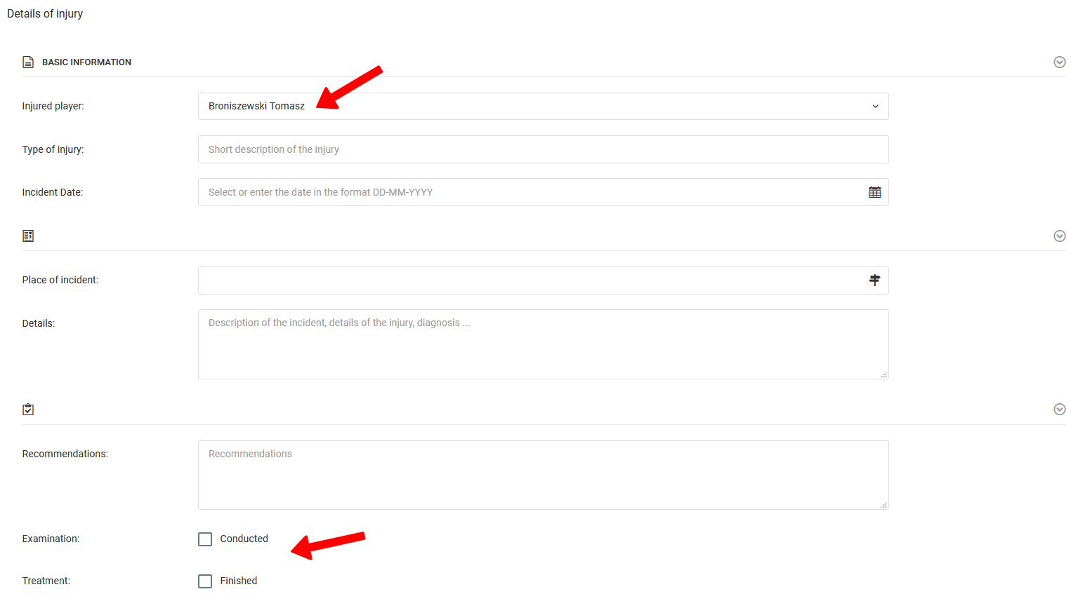 Za dodavanje ozljede odaberite s lijevog izbornika dnevnik ozljede< /b> dodaj ozljedu. Ispunite tražene podatke u obrascu koji se pojavi, počevši od imena ozlijeđenog igrača. Unesena ozljeda može se promijeniti u bilo kojem trenutku, npr. za postavljanje datuma provjere ili završetka liječenja.