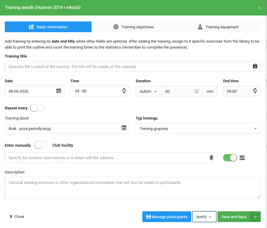 Prvi korak u kreiranju obuke je davanje naziva i navođenje datuma, vremena i trajanja. Trajanje se može podesiti ručno ili će se računati kao zbroj vremena korištenih vježbi. Sljedeći korak je određivanje mjesta vježbanja. Možete ga unijeti ručno ili odabrati s unaprijed definiranog popisa objekata koji su stvoreni u objektnom modulu.
