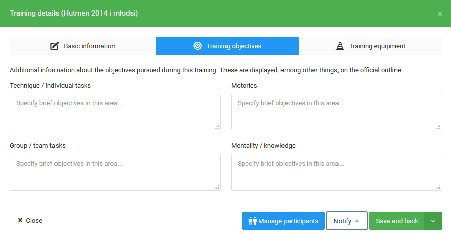 Sljedeći korak je definiranje vaših ciljeva treninga. Podijeljeni su u četiri vrste: tehnika, motorika, grupne aktivnosti i mentalitet. Zadnji korak je određivanje potrebne opreme, prema zadanim postavkama ona se generira iz vježbi dodanih treningu.