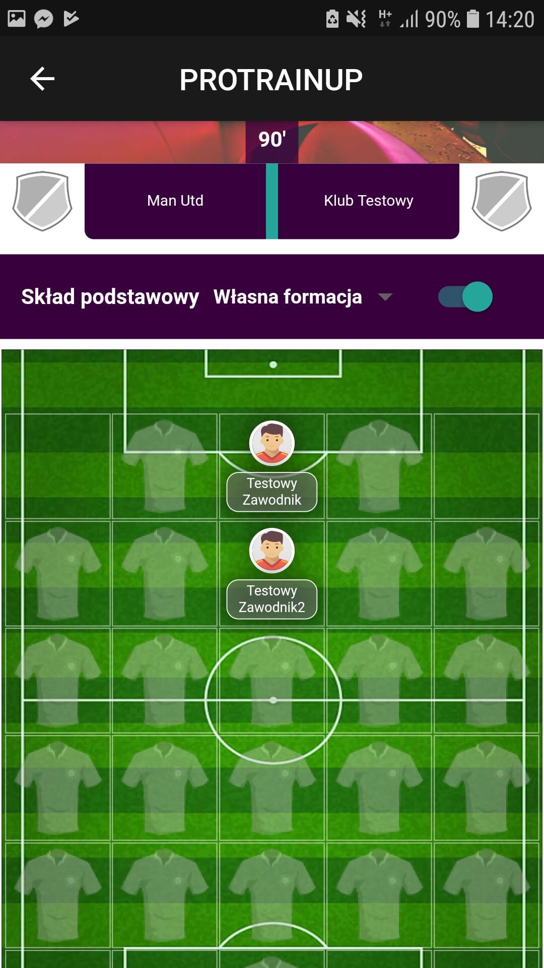 Aby zawodnikom obliczane były statystyki meczowe takie jak np. czas na boisku, musisz powołać ich do składu meczowego. Aby dodać zawodnika na boisko, złap wybranego zawodnika myszką i przeciągnij go z listy zawodników na wybraną pozycję na boisku. Ustalać skład możesz także z poziomu aplikacji mobilnej.