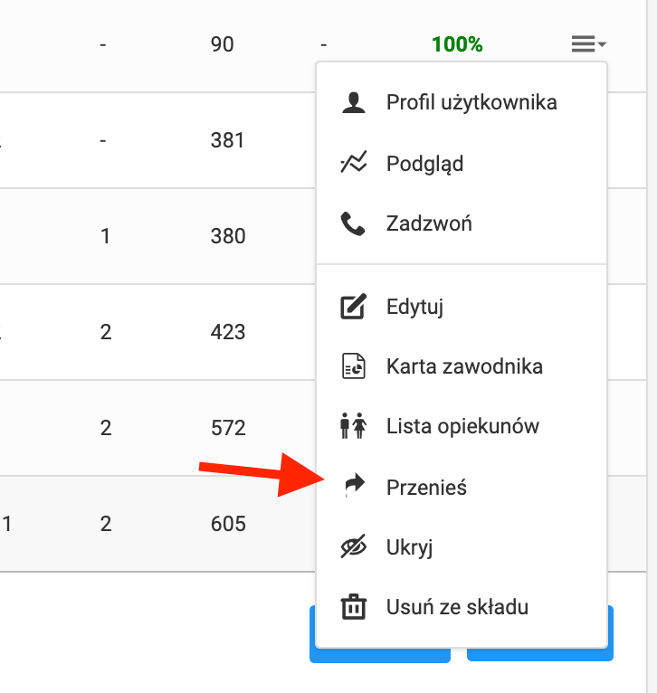 System daje możliwości kopiowania/przenoszenia zawodników między drużynami w ramach jednego podmiotu. Podczas kopiowania zawodnika mamy do wyboru opcję skopiowania lub przeniesienia zawodnika. Aby to zrobić należy na liście zawodników z menu danego zawodnika wybrać opcję "przenieś".