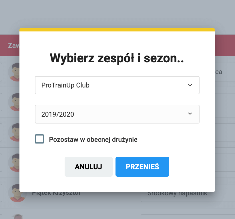 Bardzo ważnym elementem jest checkbox, którego zaznaczenie lub nie będzie skutkowało pozostawieniem zawodnika w bieżącej drużynie lub jego całkowitym, trwałym przeniesieniem do nowej, wskazanej drużyny.