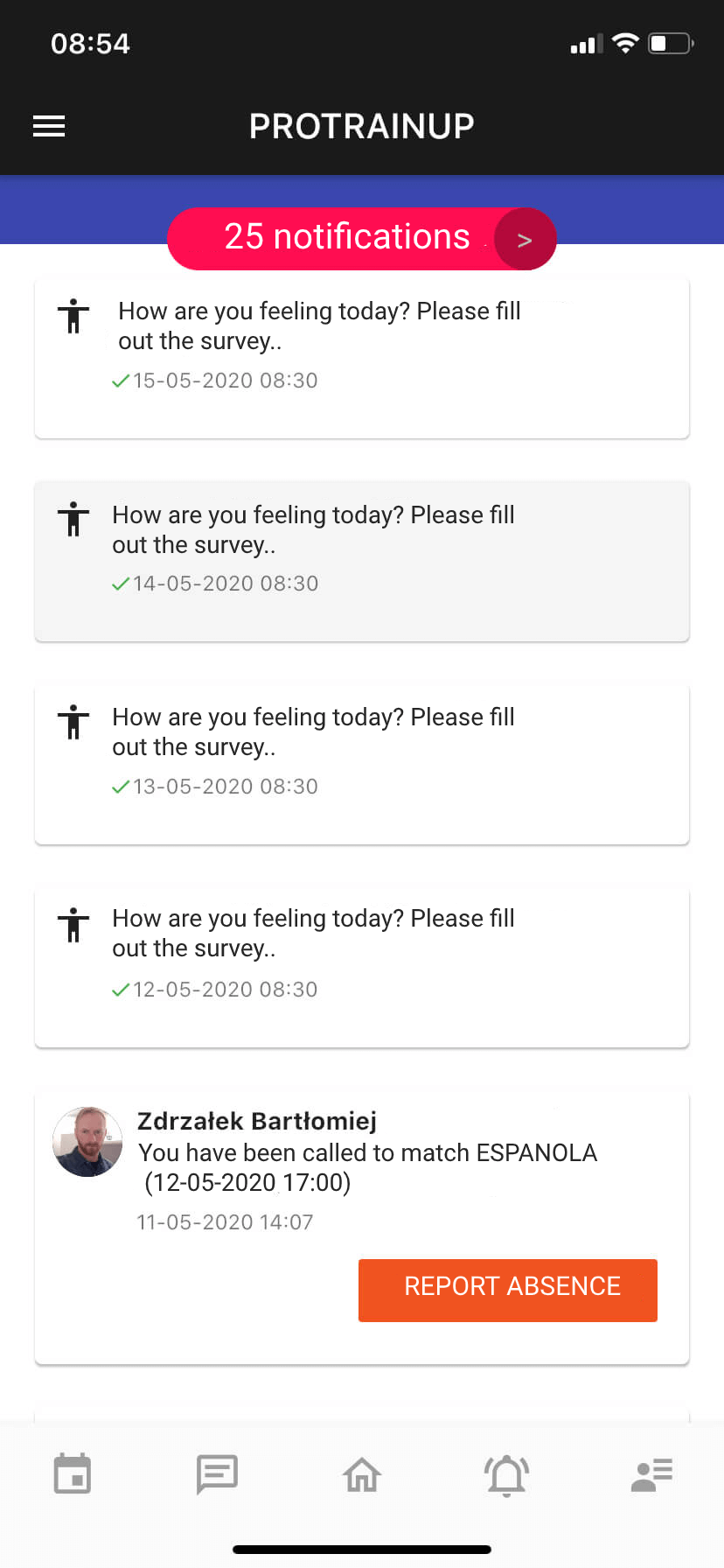 • notificação de ausência em treino/partida reportada por um pai/responsável (treinador),