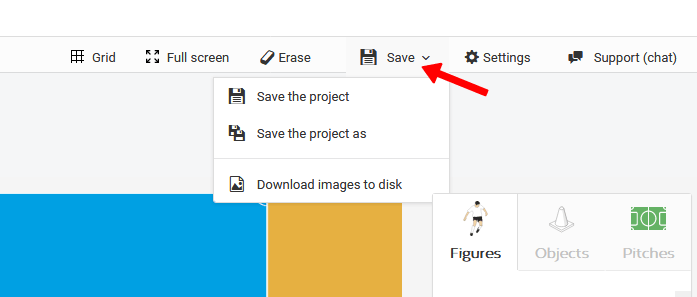 O sistema oferece três opções de salvamento. Para selecionar uma delas, clique no botão "salvar" no menu de funções superior. O desenho gráfico criado pode ser salvo como um projeto, uma variação do projeto atualmente aberto ou como um arquivo png no seu computador. Os projetos salvos aparecerão na sua biblioteca de exercícios privada.