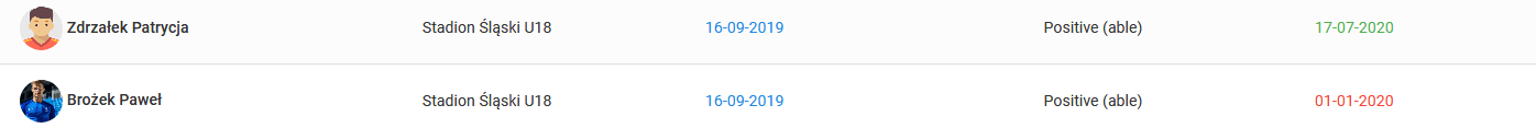 Para ir para a lista de exames, selecione no menu à esquerda diário exames lista de exames. Você verá uma tabela resumo de todos os exames realizados em uma determinada equipe. Os exames válidos são marcados em verde, enquanto os exames vencidos são marcados em vermelho.