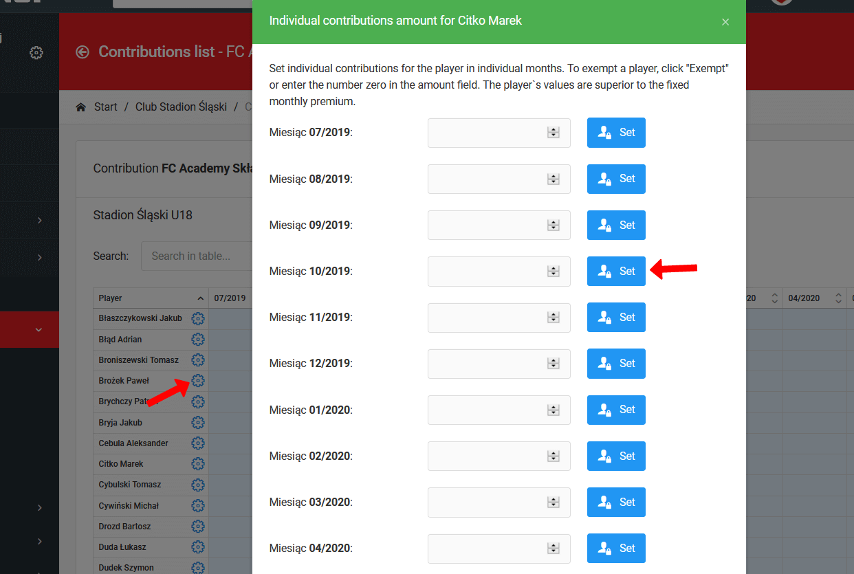 Система позволяет устанавливать индивидуальные суммы взносов для каждого игрока в клубе. Для этого перейдите в левое меню к клуб список взносов и нажмите на взнос, который вас интересует. После нажатия на название взноса вы попадете в табличное представление, где в первом столбце вы увидите список игроков. Рядом с каждым из них есть синий значок. При нажатии на значок появится окно для индивидуализации взноса.